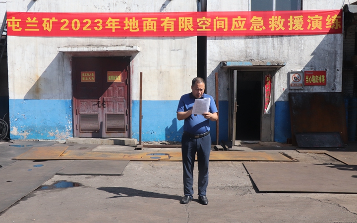 “立即启动《屯兰矿(地面)有限空间事故专项应急预案》”“不要盲目救援,先对有限空间内输送新鲜风流,保证通风,在保证现场环境安全和救援设施完备的情况下先组织自救。”随着总指挥一条条命令的下达,各组立即行动,全力以赴投入救援工作中。随着后勤服务中心主任向总指挥报告“人员已经救出,经施救人员现场救治呼吸正常,意识清醒,无生命危险,现送往医院检查治疗。”在总指挥下达“安全监察部负责调查事故原因,相关单位配合调查,追查事故责任。”的命令后,演习结束。